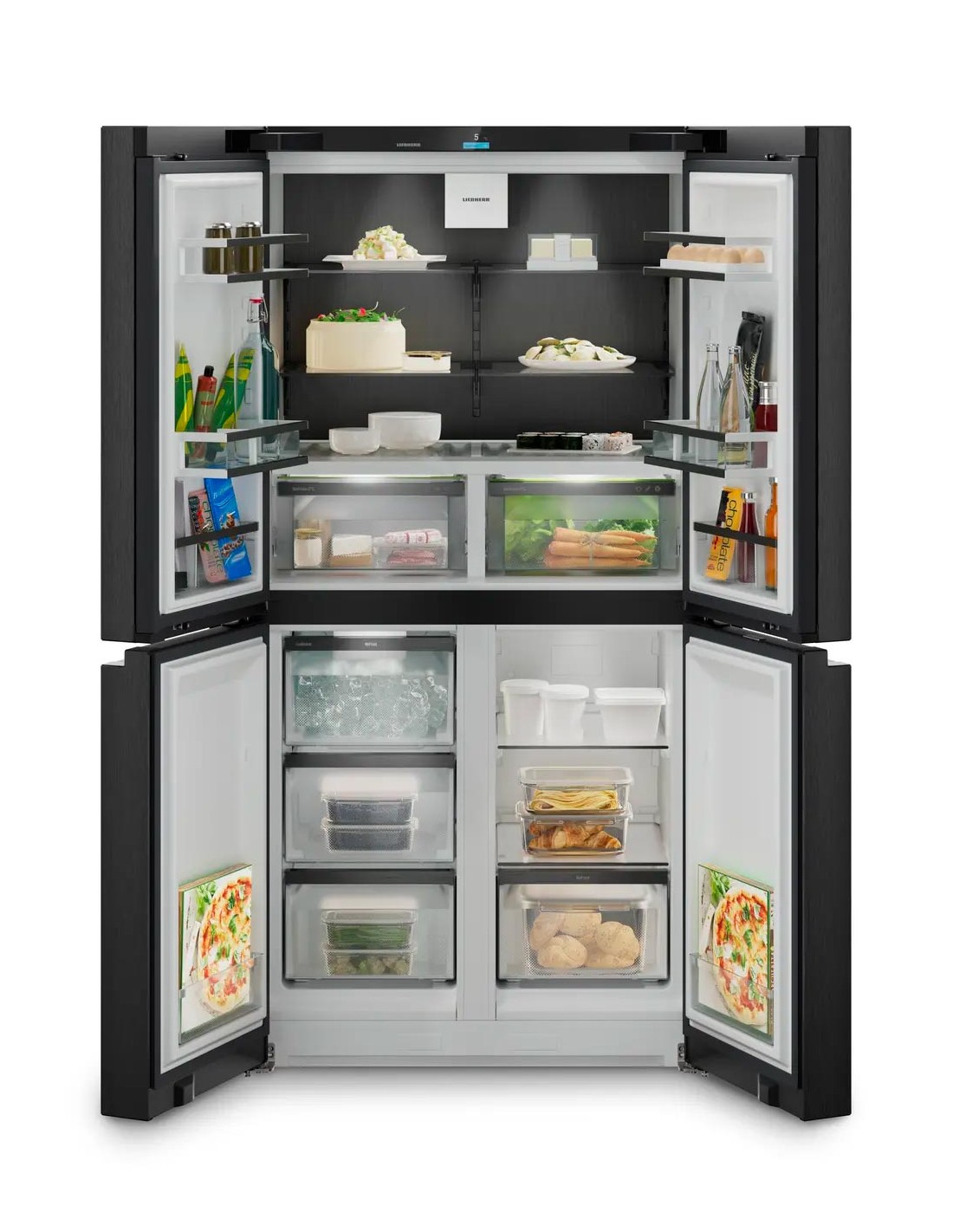 Ce réfrigérateur-congélateur à quatre portes est disponible en BlackSteel et allie un design accrocheur à une technologie de réfrigération avancée. L'IceMaker automatique intégré assure un stockage constant en glaçons. Grâce à la technologie BioFresh 0°C, les produits frais tels que les légumes, les fruits, la viande, le poisson, la charcuterie et les produits laitiers restent frais beaucoup plus longtemps. L'intérieur est conçu avec le souci du détail : l'éclairage LED lumineux et les clayettes raffinées de la porte GlassLine garantissent une présentation claire et élégante de vos aliments.