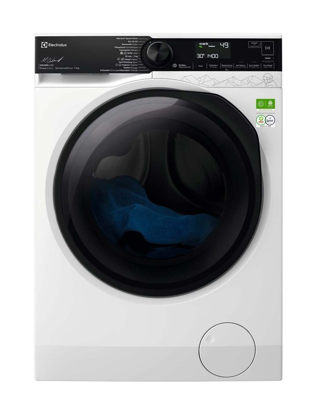 **Selon un test externe sur l’élimination de 50 taches ménagères avec le programme Odermatt Speed 49 min 30 °C avec une charge de 5 kg