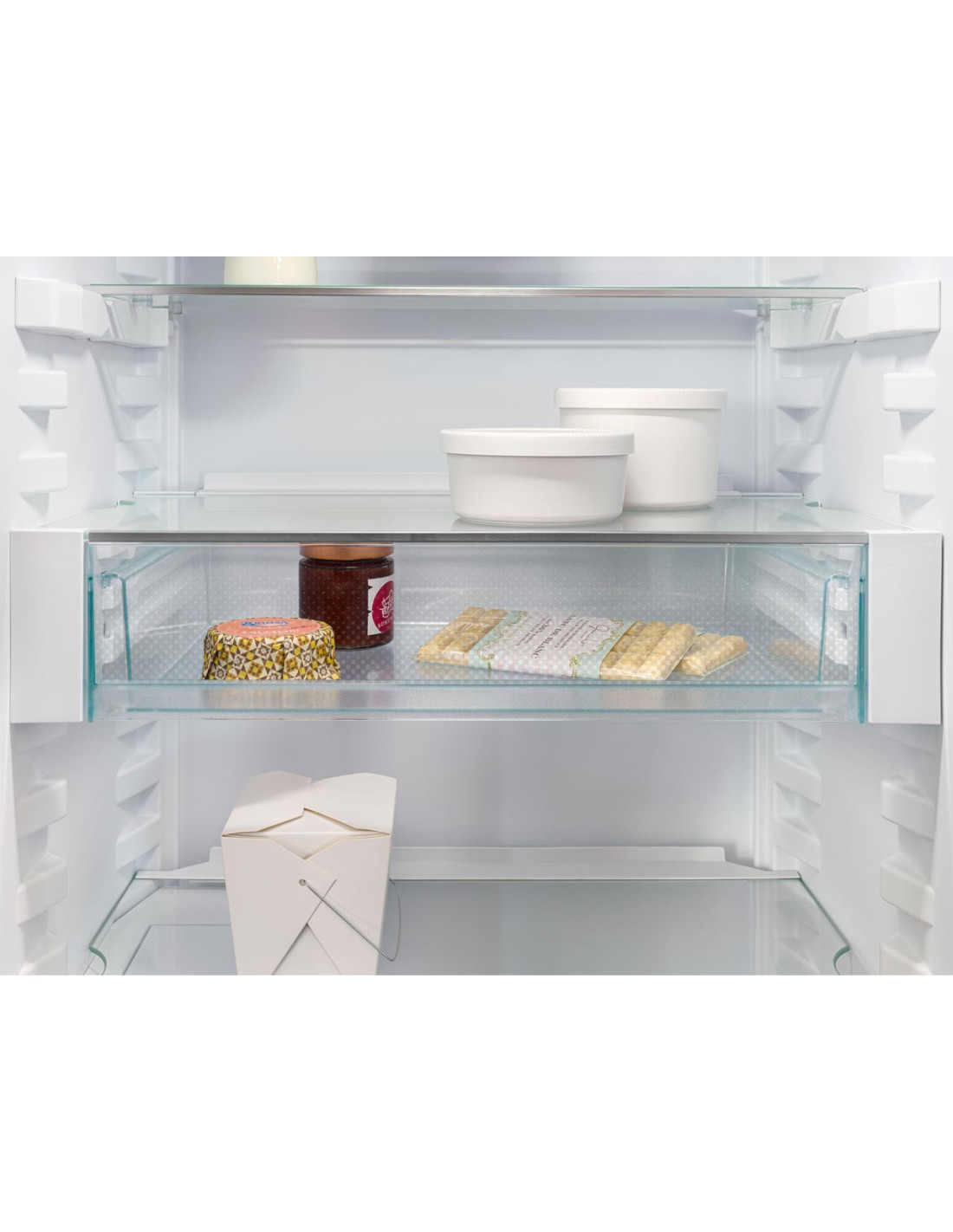 Ce réfrigérateur encastrable offre ce petit plus. La porte se ferme toujours complètement et en douceur grâce au SoftSystem et le VarioSafe offre un espace de rangement idéal pour les petits pots et récipients. La tablette divisible offre une flexibilité supplémentaire. Dans le tiroir EasyFresh, les fruits et légumes sont conservés au taux d’humidité idéal. La température est réglable via l’écran monochrome à commande tactile et affiche la température réelle. Compatible avec les applications smarthome.