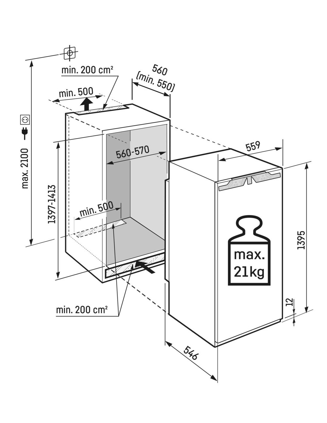 | Poids maxi. de la porte de l’élément de cuisine | 21 |